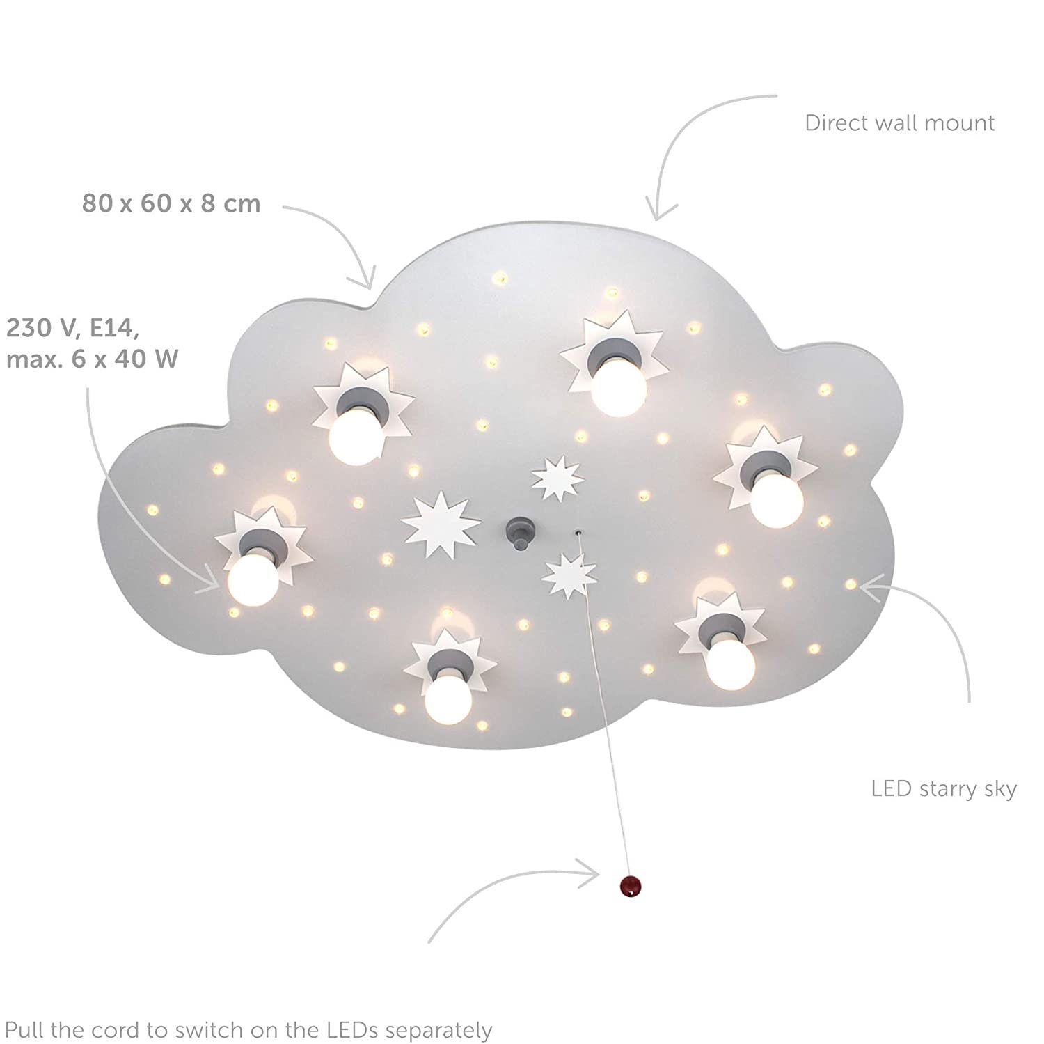 Το φωτιστικό “Star Cloud” δημιουργεί υπέροχο φωτισμό. Είναι κατασκευασμένο από φυσικό ξύλο και βαμμένο με βαφή χωρίς διαλύτες, με βάση το νερό. Εκτός από τους 6 λαμπτήρες E14, το φωτιστικό περιέχει και 40 LED, τα οποία μπορούν να ανάψουν ξεχωριστά. Ανάβει ή σβήνει με τον διακόπτη και επιπλέον, μπορείτε να επιλέξετε ανάμεσα σε τρεις διαφορετικές παραλλαγές φωτισμού χρησιμοποιώντας τον διακόπτη που υπάρχει πάνω στο φωτιστικό.