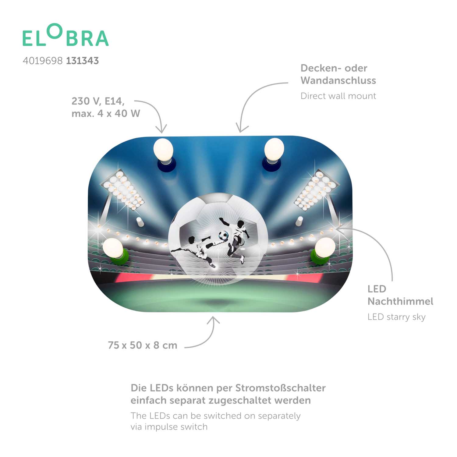 Διαθέτει 4 λαμπτήρες E14, δεν συμπεριλαμβάνονται, και 40 ενσωματωμένα LED.