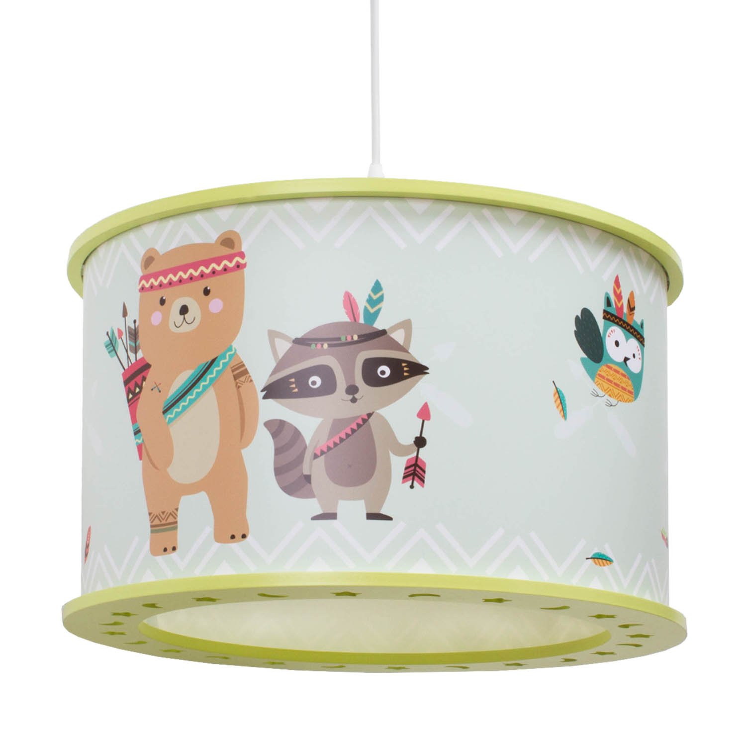 Το κρεμαστό φωτιστικό “Little Indians” δημιουργεί υπέροχο φωτισμό. Το μικρό ρακούν και το αρκουδάκι ζούνε μαζί με τους άλλους Ινδιάνους φίλους τους σε μια φυλή, με στόχο να φωτίσει τα δωμάτια των παιδιών. Με το χαριτωμένο μοτίβο και τα χρώματα που ταιριάζουν, το φωτιστικό γίνεται πραγματικά εντυπωσιακό.